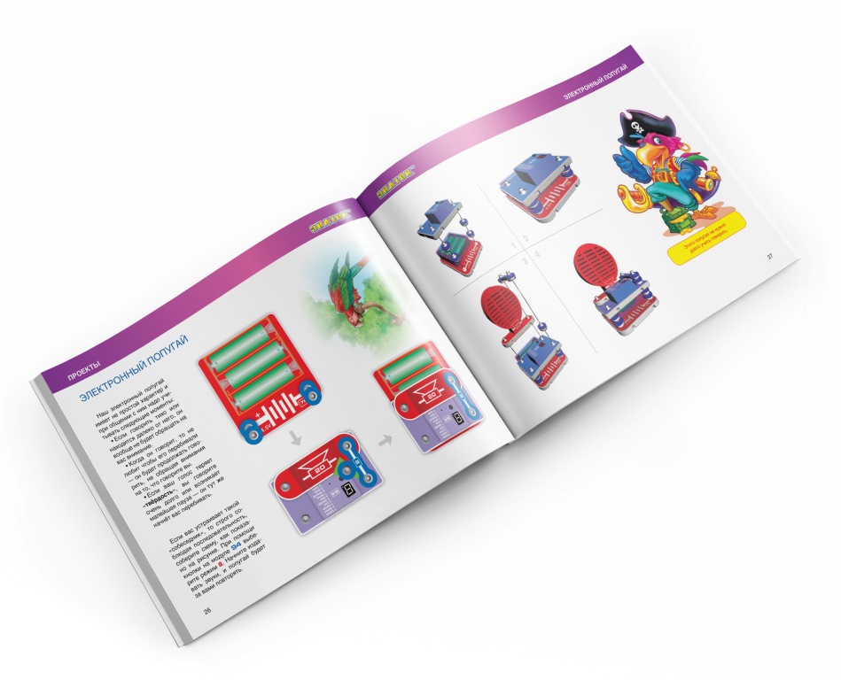 К конструктору прилагается цветное «Руководство пользователя» по сборке различных проектов. Помимо этого в прилагаемой книге вы найдёте перечень и описание элементов конструктора. Для удобства собирания деталей в коробку на последней обложке приведена схема расположения элементов.