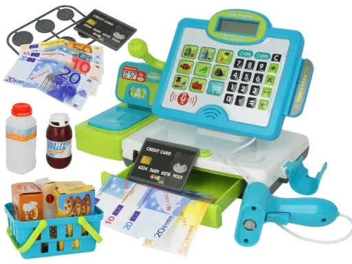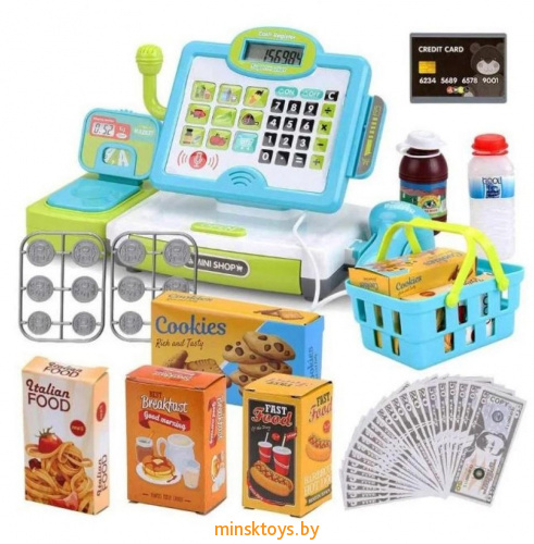 Касса с деньгами откроется только после нажатия соответствующей кнопки. Также в наборе присутствует функциональная платежная карта и деньги. Чтобы играть было еще интереснее в комплекте вы найдете целый набор свежих продуктов в корзинке. Игрушка работает от 2-х батареек типа «АА» 1.5V (не входят в комплект), размер 33-14-21 см.