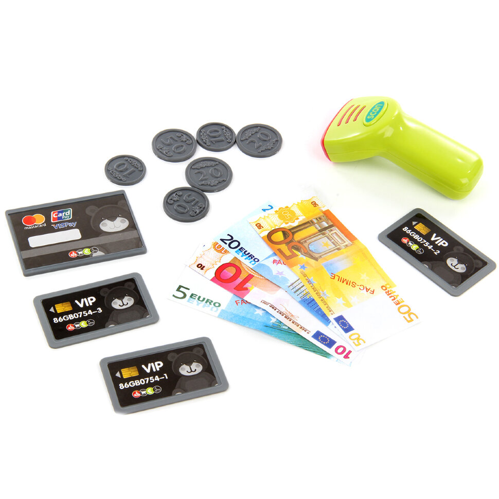 В комплект входят касса, сканер, 3 карты VIP-клиента, банковская карта, монетки-имитации денег, банкноты-имитации денег, коробочки-имитации вкусняшек, бутылочка-имитация сока, бутылка-имитация молока, бутылка-имитация кетчупа.