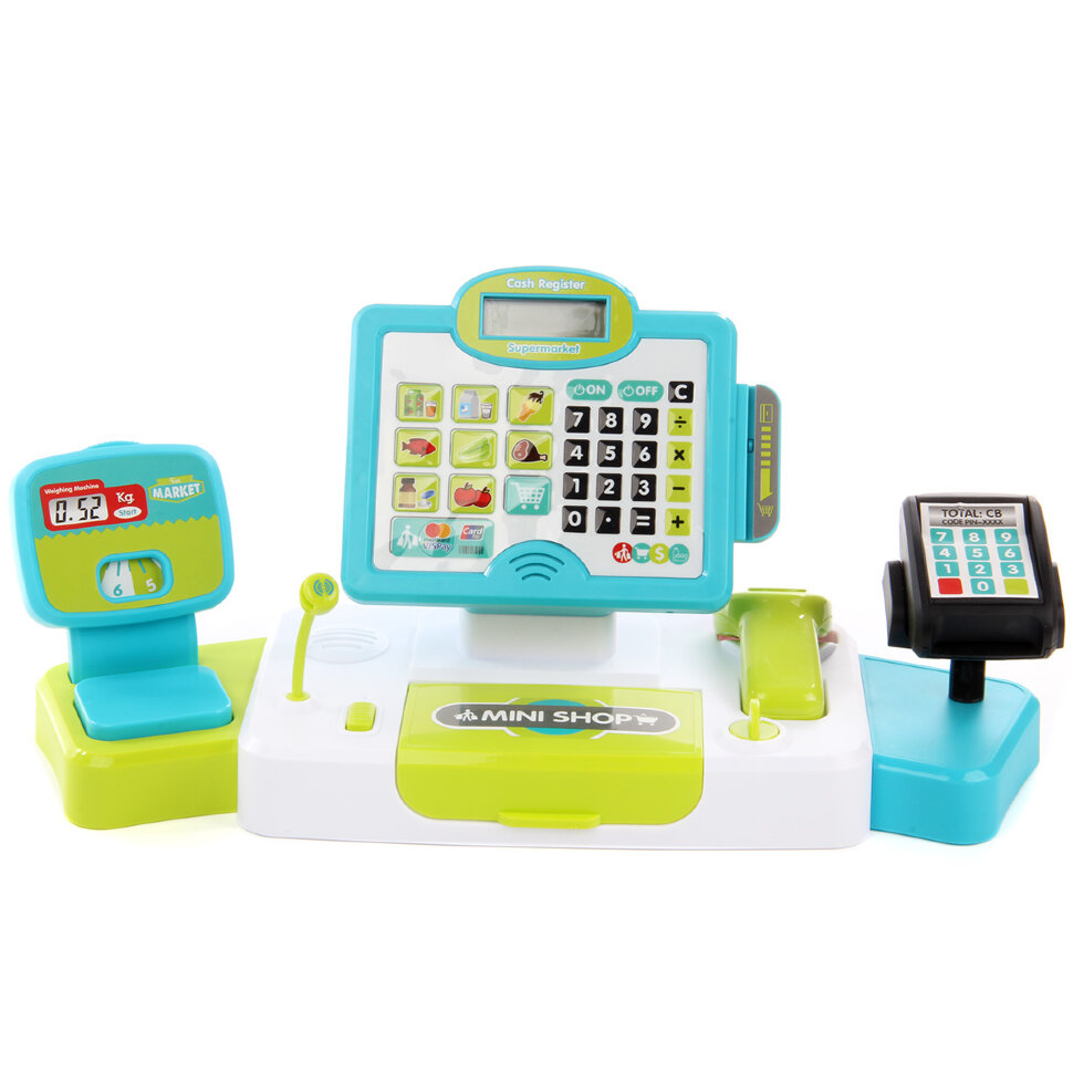 Функционал кассы: - при нажатии на кнопки издает писк; - проигрывает мелодию; - если провести картой по считывателю, издаст соответствующий звук; - отделение для денег открывается; - кассу можно использовать в качестве калькулятора; - при нажатии на кнопки с изображением продуктов на табло высветится их цена; - микрофон декоративный; - считыватель крутится на 360 градусов; - у весов можно менять числовые показания, прокручивая колесико в верхней части, поле, где взвешивают продукты, прогибается.