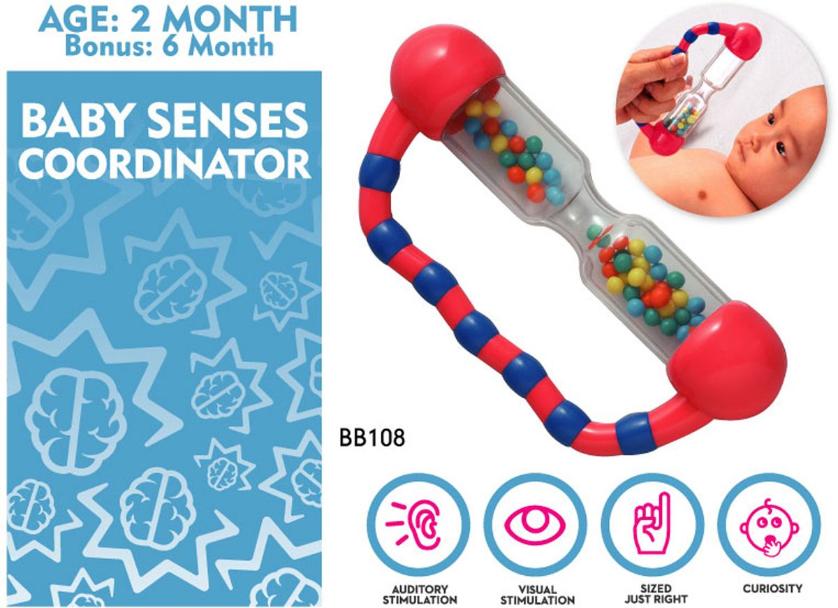 2 месяца: Стимулирует зрение и слух ребенка, благодаря тому, что ребенок внимательно следит за цветными бусинами, перемещающимися вправо и влево в руках родителей. Разные объекты и звуки важны для развивающегося ума ребенка. Игрушка помогает развивать концентрацию внимания в раннем возрасте.