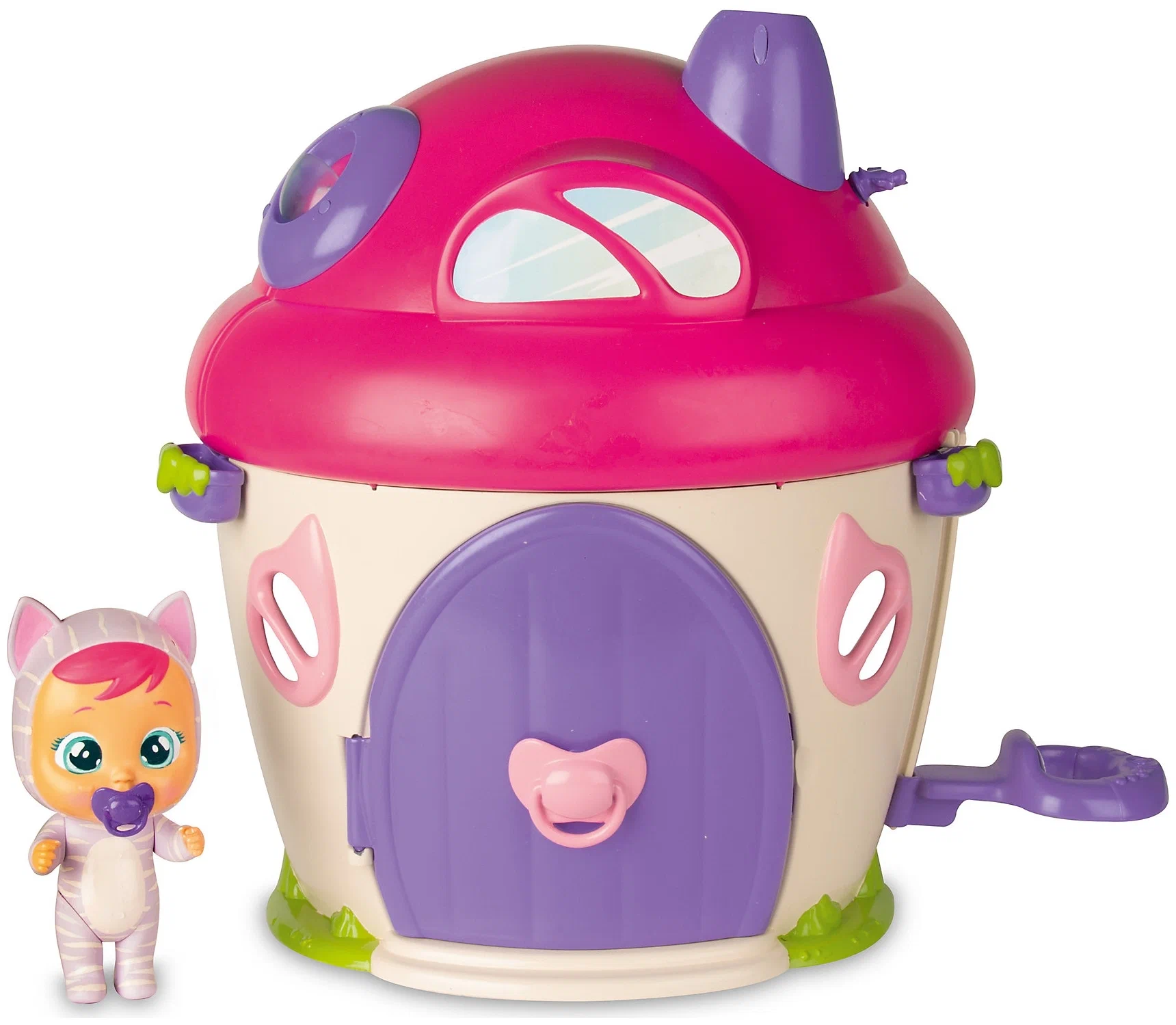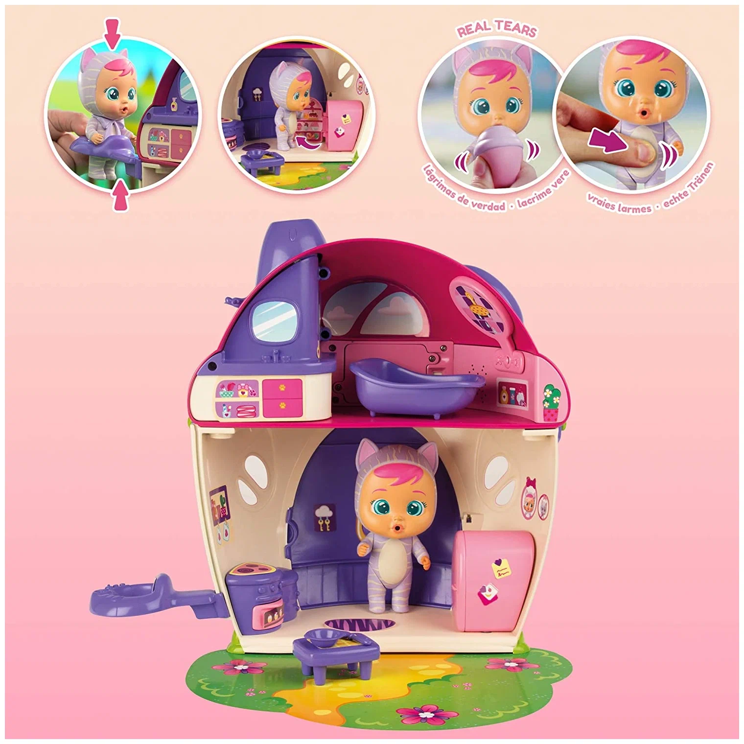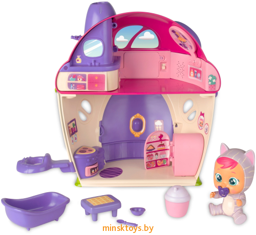 Игровой набор IMC Toys 97940 CRYBABIES Плачущий младенец Кэти в комплекте с домиком и аксессуарами. Малышка Кэти живет в красивом двухэтажном домике, где у нее есть не только кухня для приготовления угощений, но и ванная, в которой героиня игры расслабляется и слушает музыку. Жилище Кэти удивит детей привлекательным внешним видом, а также мыльными пузырями, которые неожиданно появятся из трубы. Особенности: Миниатюрная малышка Кэти плачет необычными слезами, которые оживляют ее красивый домик, и из его трубы неожиданно появляются мыльные пузыри. В распоряжении героини игры есть двухэтажное жилище, на первом этаже которого расположена кухня с плитой и холодильником.