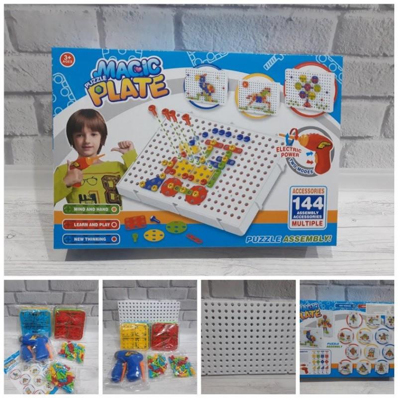 Мозаика "Magic Plate" включает: 144 ярких детали разной формы и болтов, 1 отвертка и электрический шуруповерт ( батарейки в комплект не входят ).