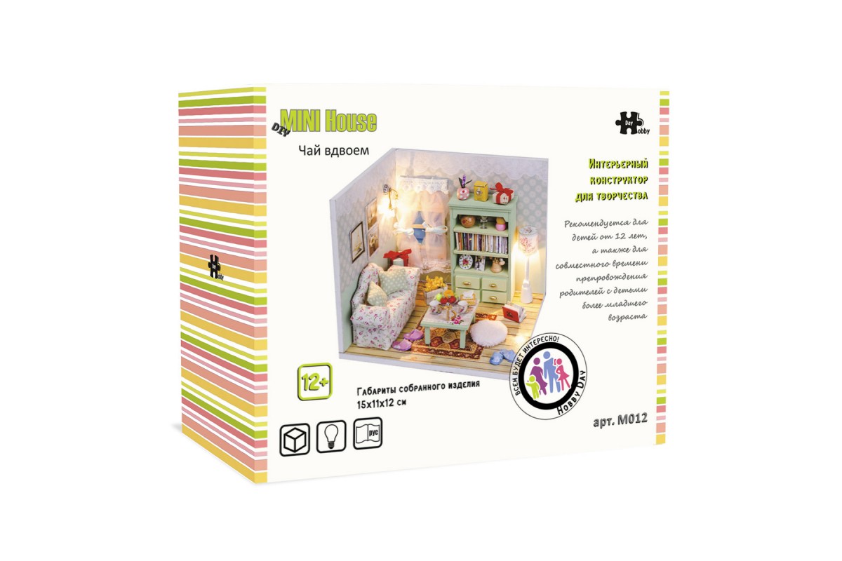 Настоящая маленькая комната для чаепития! Для него и для нее! Маленькие подушечки, маленькие чашечки, маленькие книжечки и много других милых деталей в этом замечательном наборе серии "сделай сам". Подарите себе или своим близким интерьерный конструктор DIY Mini House и проведите время за интереснейшим занятием! В результате получите очень реалистичную маленькую комнату, выполненную в красочных тонах и продуманную до мелочей. Размер готового изделия 14,6х10,5х12,2 см.