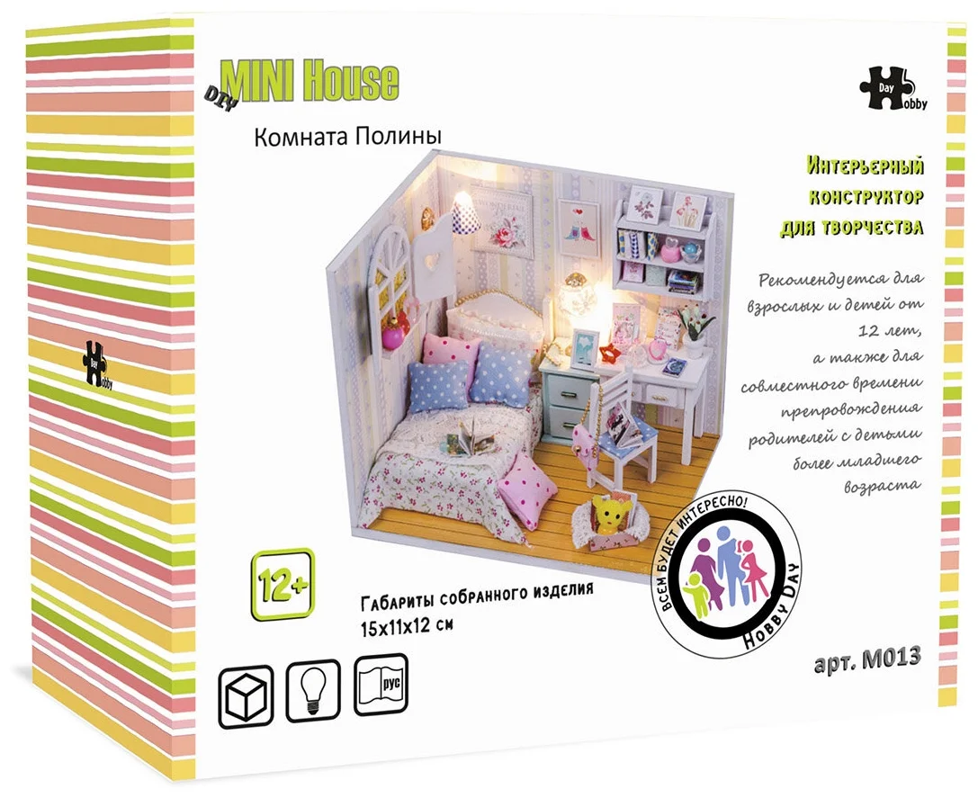 Румбокс Diy House «Комната Полины» - конструктор миниатюрной комнатки, в деталях повторяющий интерьер спальни для девочки. Лучшие дизайнеры ИКЕА позавидуют тому, как на маленькой площади поместились кровать, прикроватная тумба, рабочий стол, настенные полки и даже ещё свободное место осталось. Всё просто, компактно и очень функционально! Прекрасная и нежная девичья спальня, которая в собранном виде поместится на ладонях!