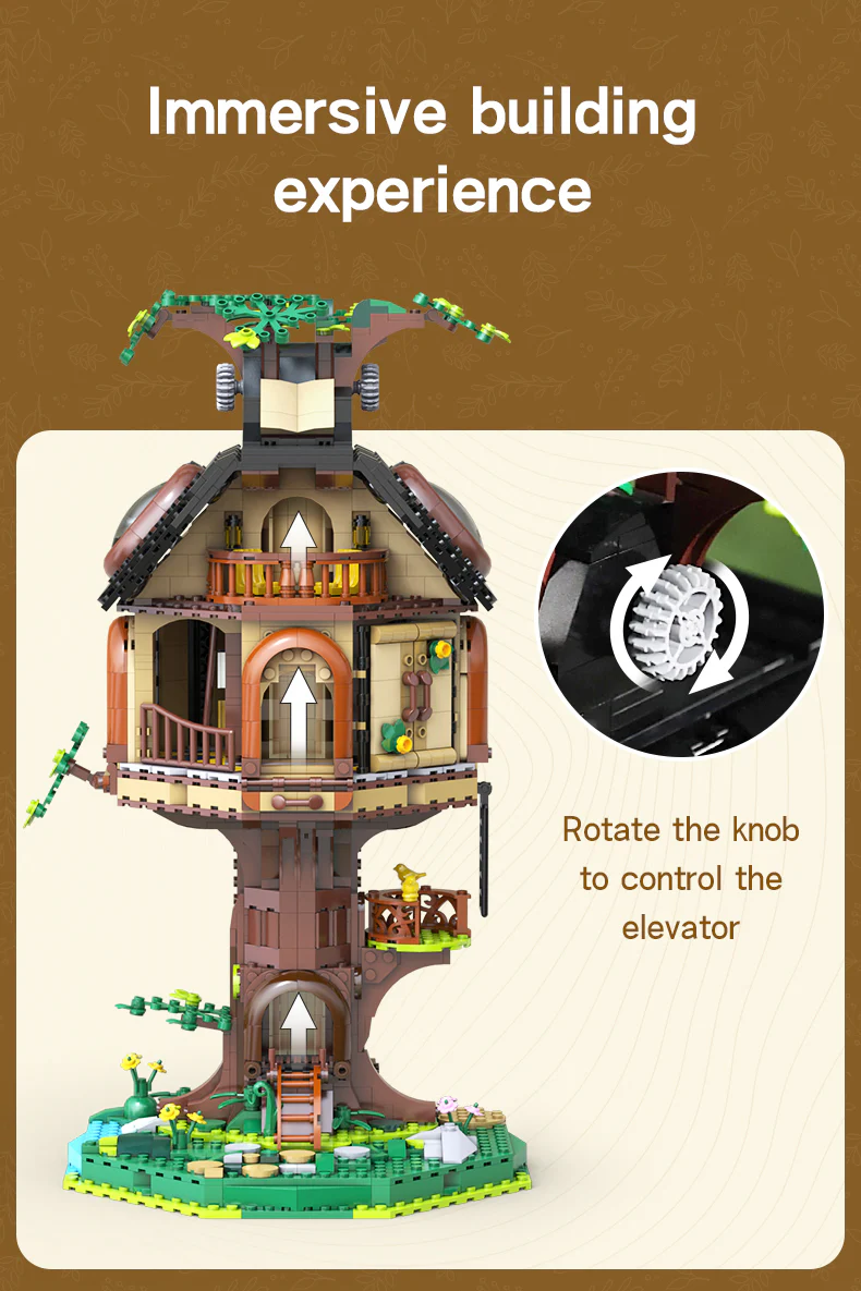 Внутри здания на первом этаже расположена библиотека с книжными полками, лестницами и окнами, а на втором этаже - уютный читальный зал с телескопом и дополнительными книжными полками. Модель оснащена лифтом, которым можно управлять, поворачивая ручку на вершине дерева.