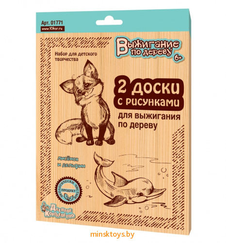 Симпатичные и забавные животные Дельфин и лисенок не оставят равнодушным не только ребенка, но и любого взрослого человека. Рисунки на досках из этого набора предназначены для тех, кто уже освоил технику выжигания.