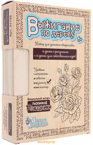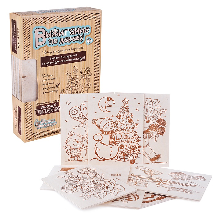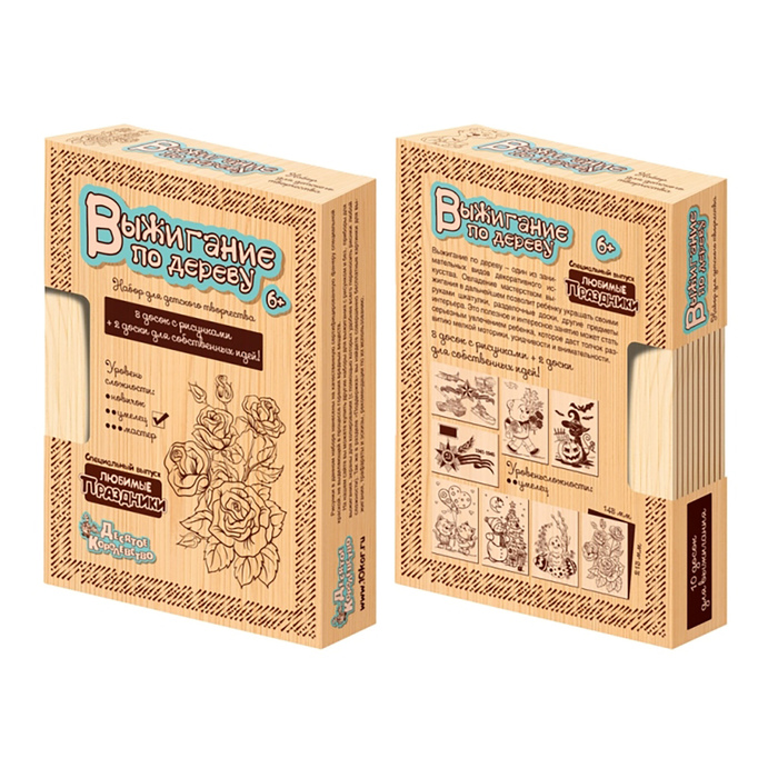 Доски для выжигания по дереву изготовлены из качественной фанеры, а трафареты рисунков выполнены специальной немецкой краской, не выделяющей в процессе горения вредных веществ. В наборе 10 досок, 8 с рисунками, посвященные различным событиям, в том числе любимым праздникам и 2 доски для собственных идей.