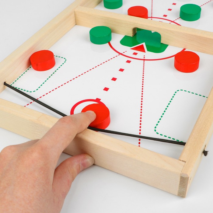 Цель игры – первым выбить все фишки своего цвета на сторону противника. Для этого необходимо натянуть фишку на резинку, прицелиться и отправить её прямо через центральные ворота на половину противника! Тот, кто сделает это быстрее, становится победителем игры.