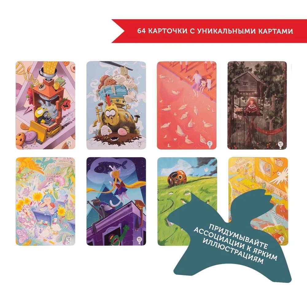 Каждый игрок получает карточки с рисунками. Ведущий (его роль передаётся всем по кругу) придумывает и озвучивает ассоциацию к любой иллюстрации на руках. А участники в свою очередь ищут среди своего набора подходящую по описанию карту. После этого все карты, обязательно в закрытую, выкладываются на стол. Вы должны найти среди них карту ведущего и проголосовать за неё. Угадавшие игроки получают победные очки.Ведущему нужно быть внимательным: его карту должно угадать большинство игроков, но не все.
