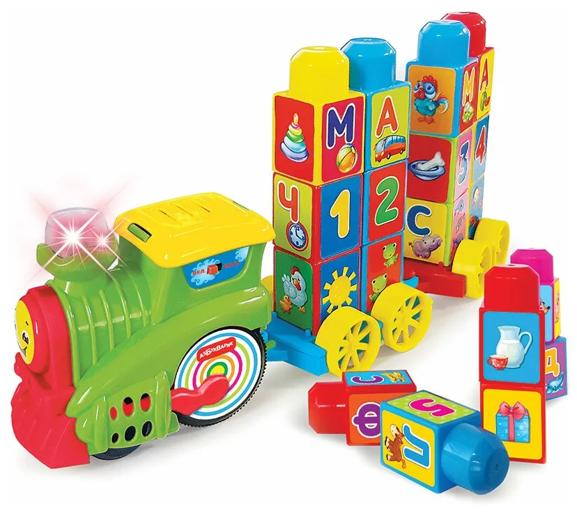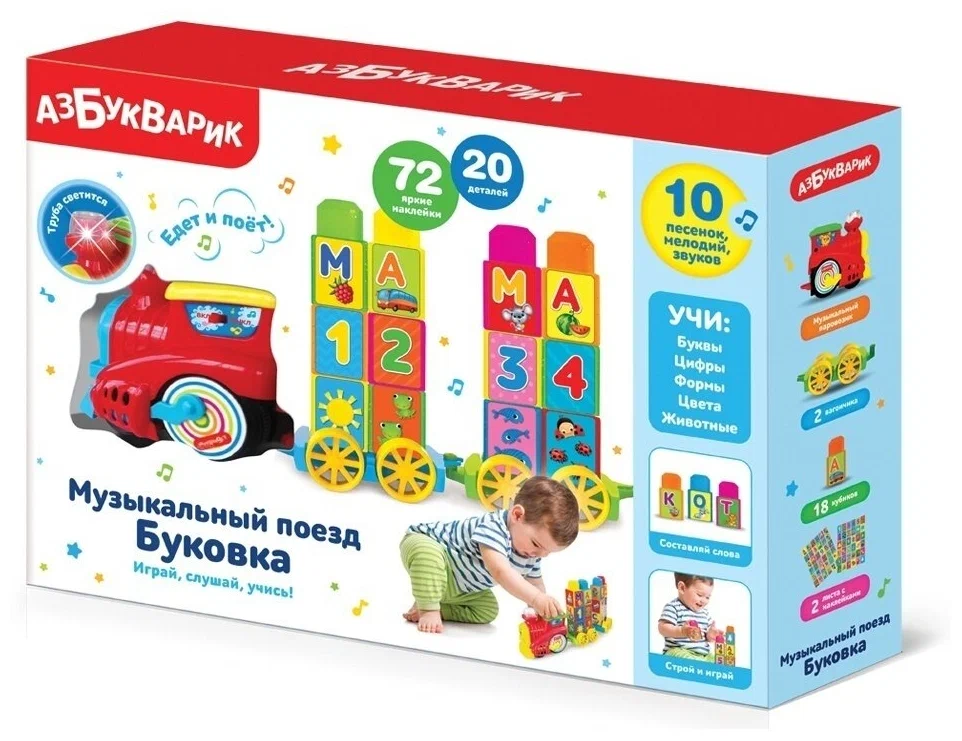Музыкальный поезд Буковка – это уникальная развивающая игрушка «2 в 1»: музыкальный паровозик и обучающий конструктор. Включи паровозик – он поедет сам и будет петь песенки и издавать настоящие звуки паровоза! Цепляй вагончики – паровозик легко повезет их за собой! Хочешь покатать зверят? Посади их в вагончики – прикрепи нужные кубики. Строй из кубиков башни, фигуры, учи буквы, цифры, формы, цвета и животных. Составляй из букв слоги и слова, подбирай логические пары – с этим поездом-конструктором можно придумать более 10 обучающих игр!