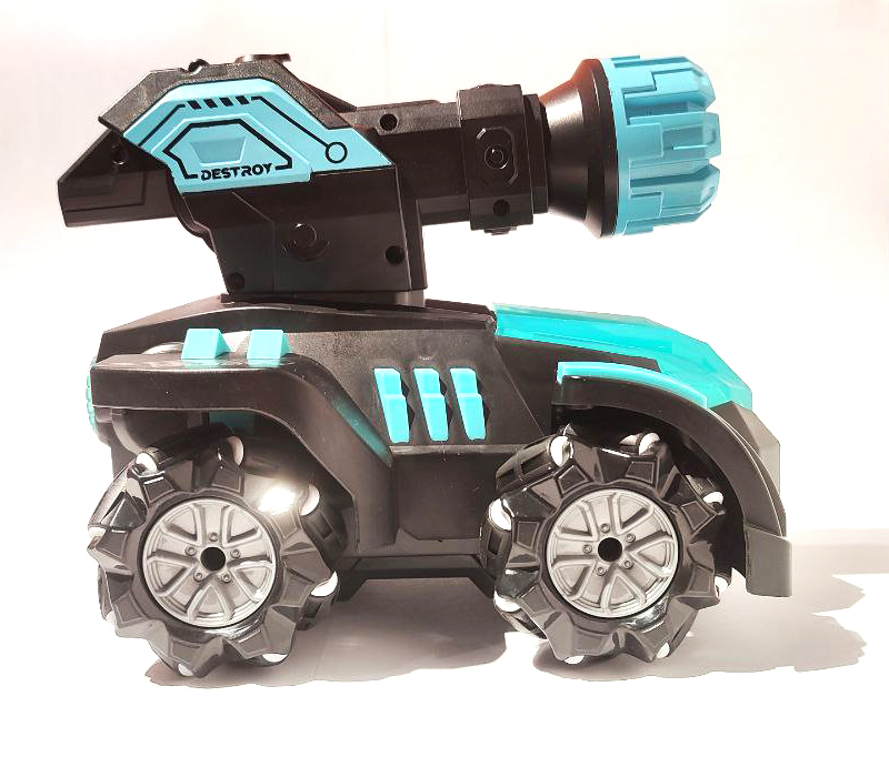 Машина на радиоуправлении на роликовых колесах. Благодаря необычной конструкции колес, машинка может ездить не только вперед-назад, влево-вправо, а еще и боком, и даже по диагонали. Со световыми эффектами, стреляет водяными пулями.