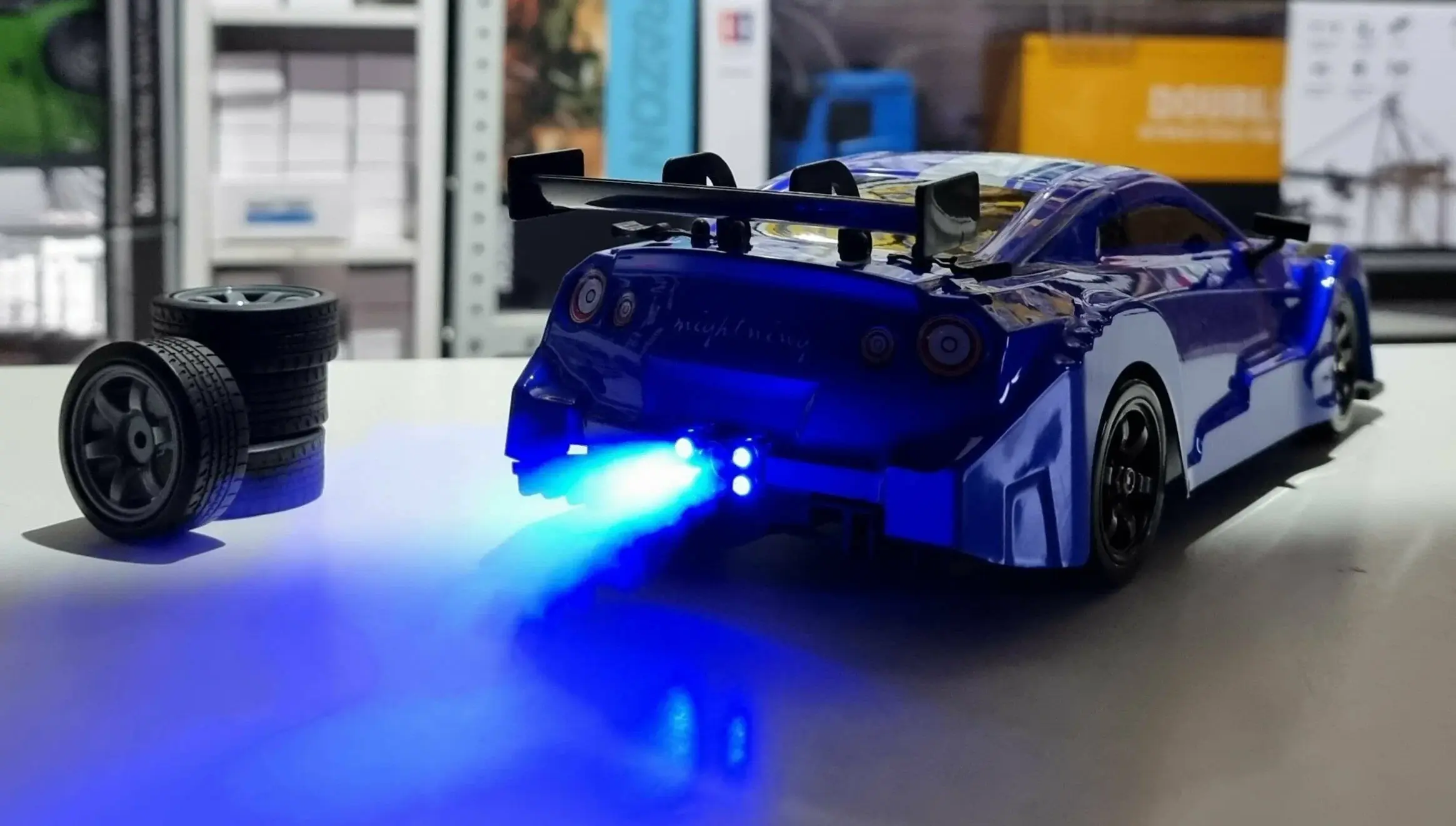 машинка для дрифта, пульт управления, ёмкость для воды, 2 комплекта колёс, ключ, аккумулятор, зарядное стройство |