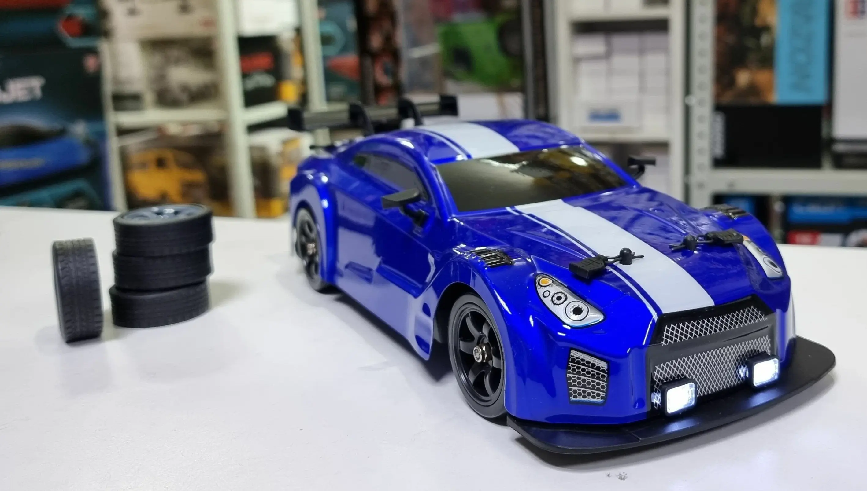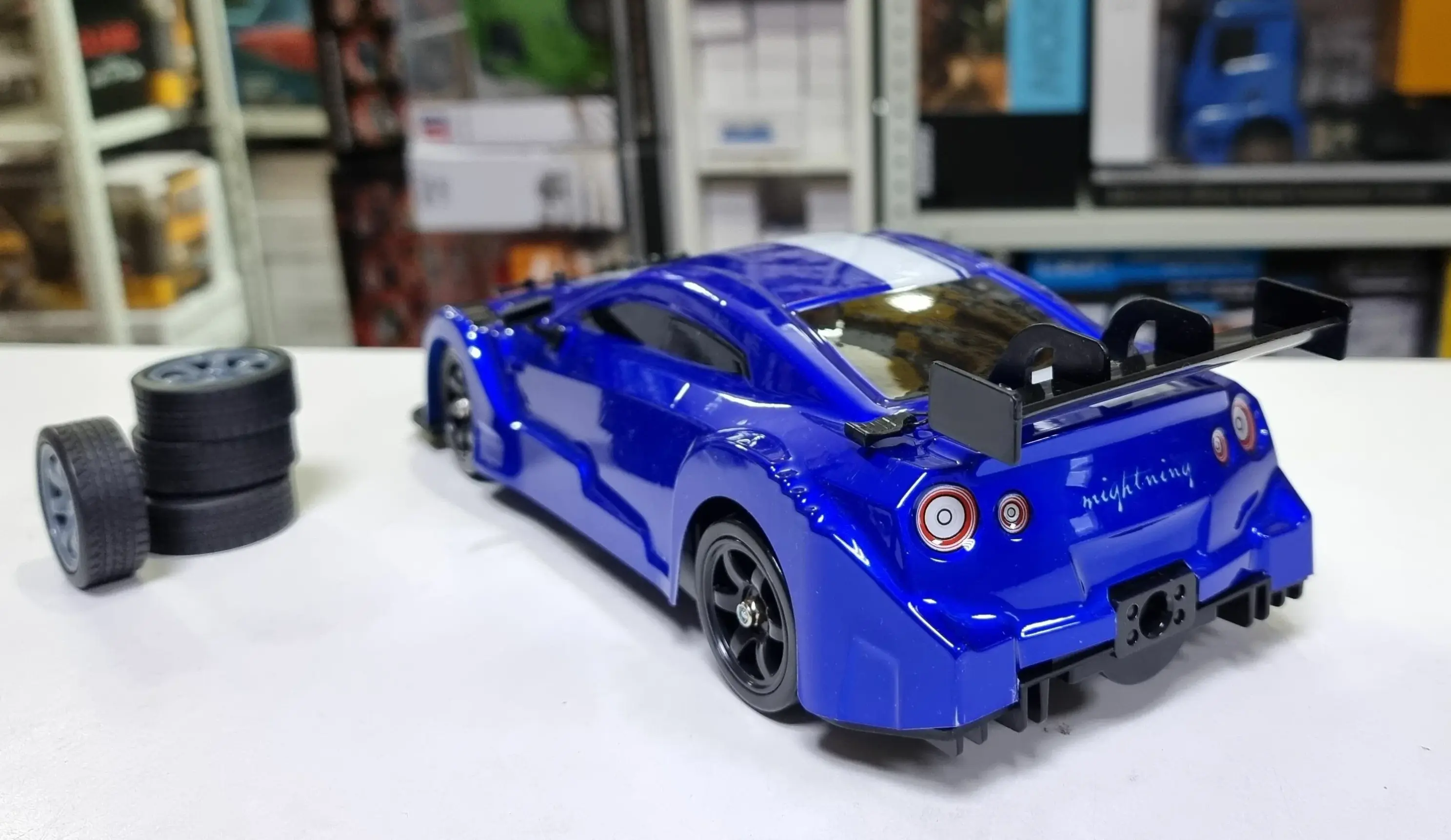 Машинка поставляется в комплекте со всем необходимым: резиновыми шинами, пультом управления, аккумулятором и USB-кабелем для зарядки. Помимо этого, машинка оснащена аккумулятором для продолжительной игры без лишних перерывов.