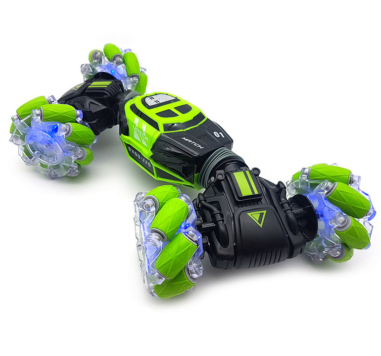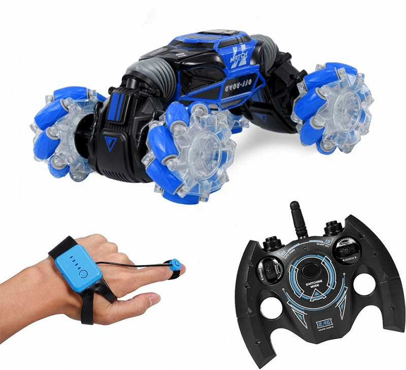 Радиоуправляемый внедорожник-перевертыш может ездить, крутиться на месте, переворачиваться и ехать дальше, приподниматься и даже танцевать. Но главная особенность заключается в управлении. Данной машинкой можно управлять жестами при помощи специального браслета, который входит в комплект. Управление сопровождается звуками работающего мотора, яркой подсветкой колес и музыкой. Особенно эффектно машинка смотрится в темноте.