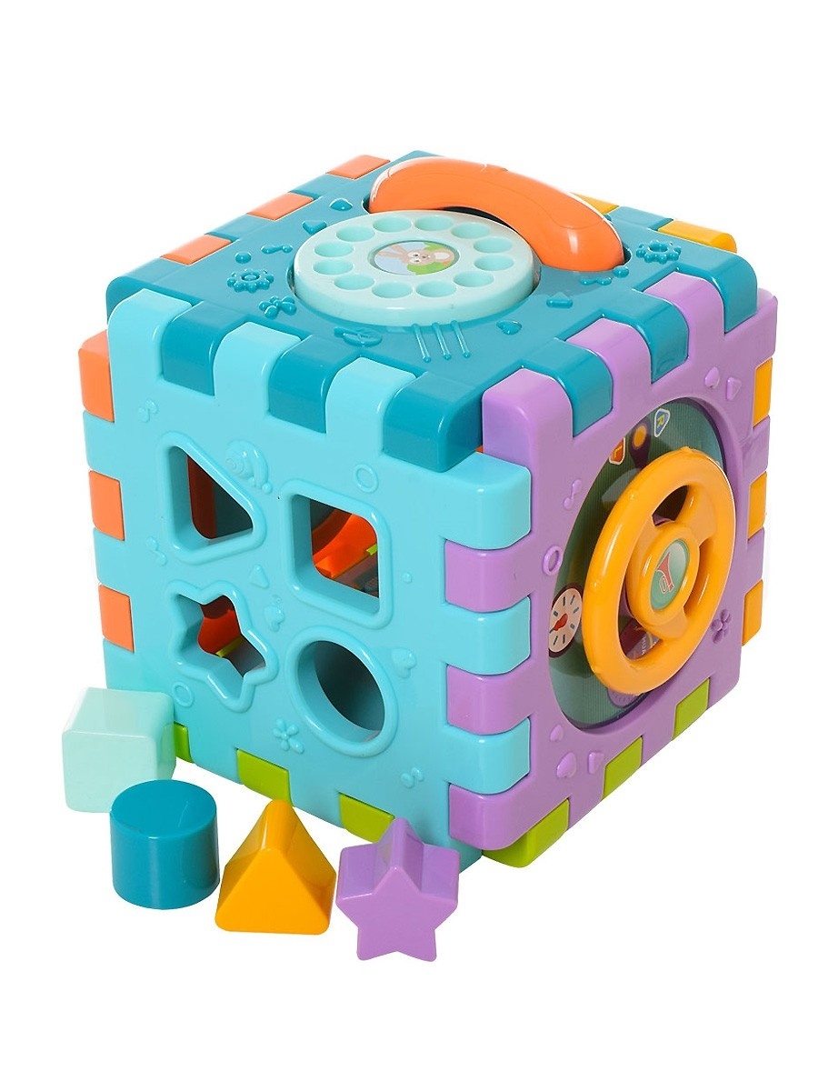 - Также, это игрушка-сортер, в ней есть фигурные отверстия, к которым нужно подобрать фигурку соответствующей формы и протолкнуть ее внутрь куба.