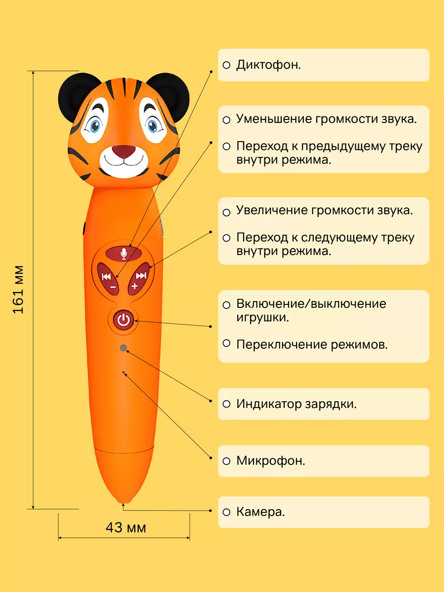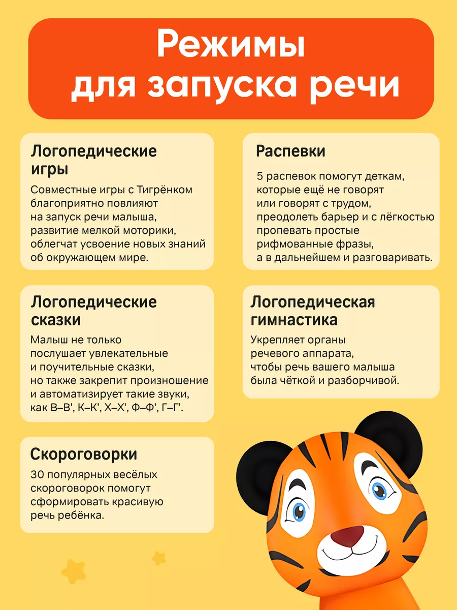 Внутри собрано 8 режимов: логоигры, логопедические сказки, скороговорки, распевки, логогимнастика. А также звуки природы, диктофон. Подключите наушники, и это уже удобный детский плейер. Дополнительная память позволяет загружать свой контент. С такой музыкальной игрой процесс обучения будет простым, увлекательным и разнообразным – дети с удовольствием будут учиться и играть самостоятельно! В форме веселых занятий тренируем воображение, пополняем словарный запас. В серии три ярких образа: Панда Тичи, Собачка Буля, Тигрёнок Рыки — выберите своего персонажа. Занимают мало места — возьмите с собой в дорогу или на прогулку. Работает без батареек, заряжается от розетки. Оригинальный подарок на праздник для мальчиков или девочек.