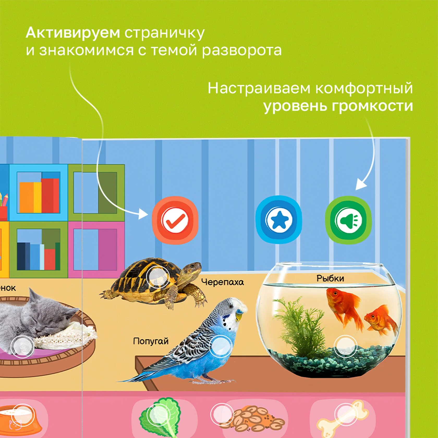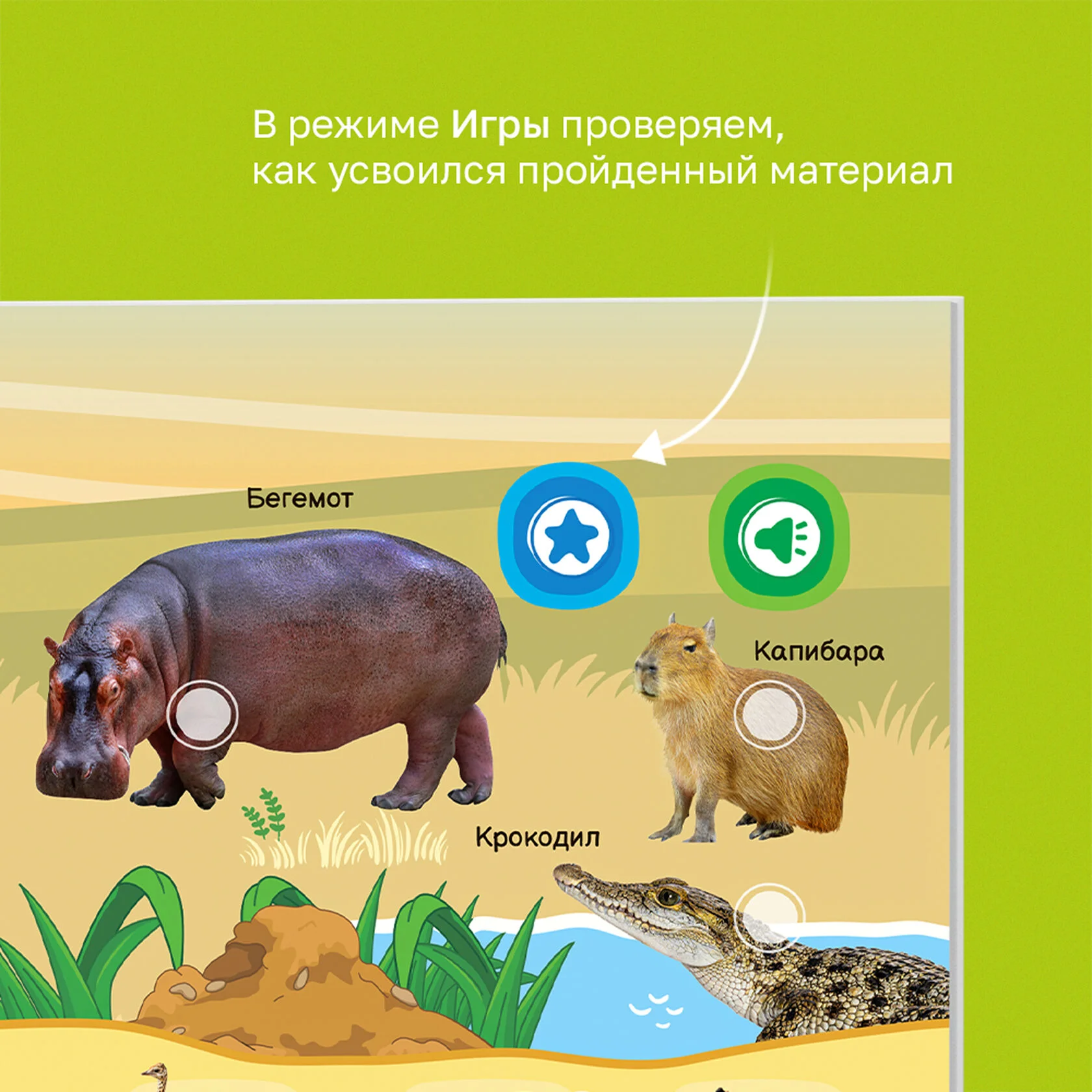 - Слушаем названия, звуки и интересные факты — познавательная информация о животных.
