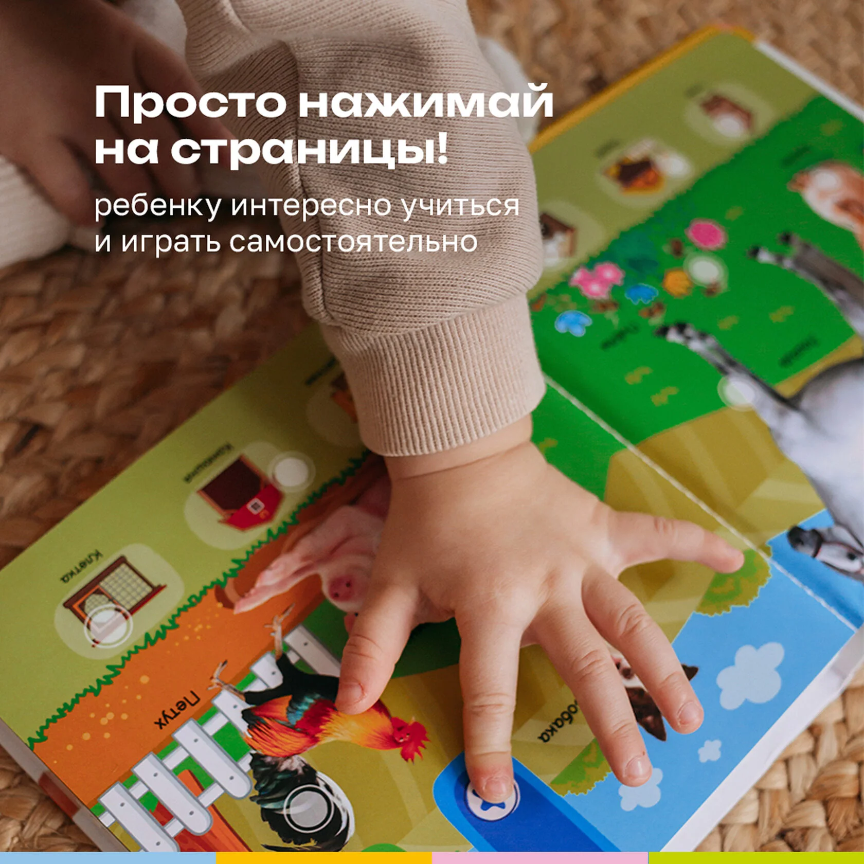 Эта удивительная книга станет первой энциклопедией вашего малыша, которую можно брать с собой куда угодно. Просто нажмите пальчиком на страницы — и картинки оживут! Внутри 20 интерактивных страниц с красочными фотографиями животных, увлекательными заданиями и реалистичными звуками.