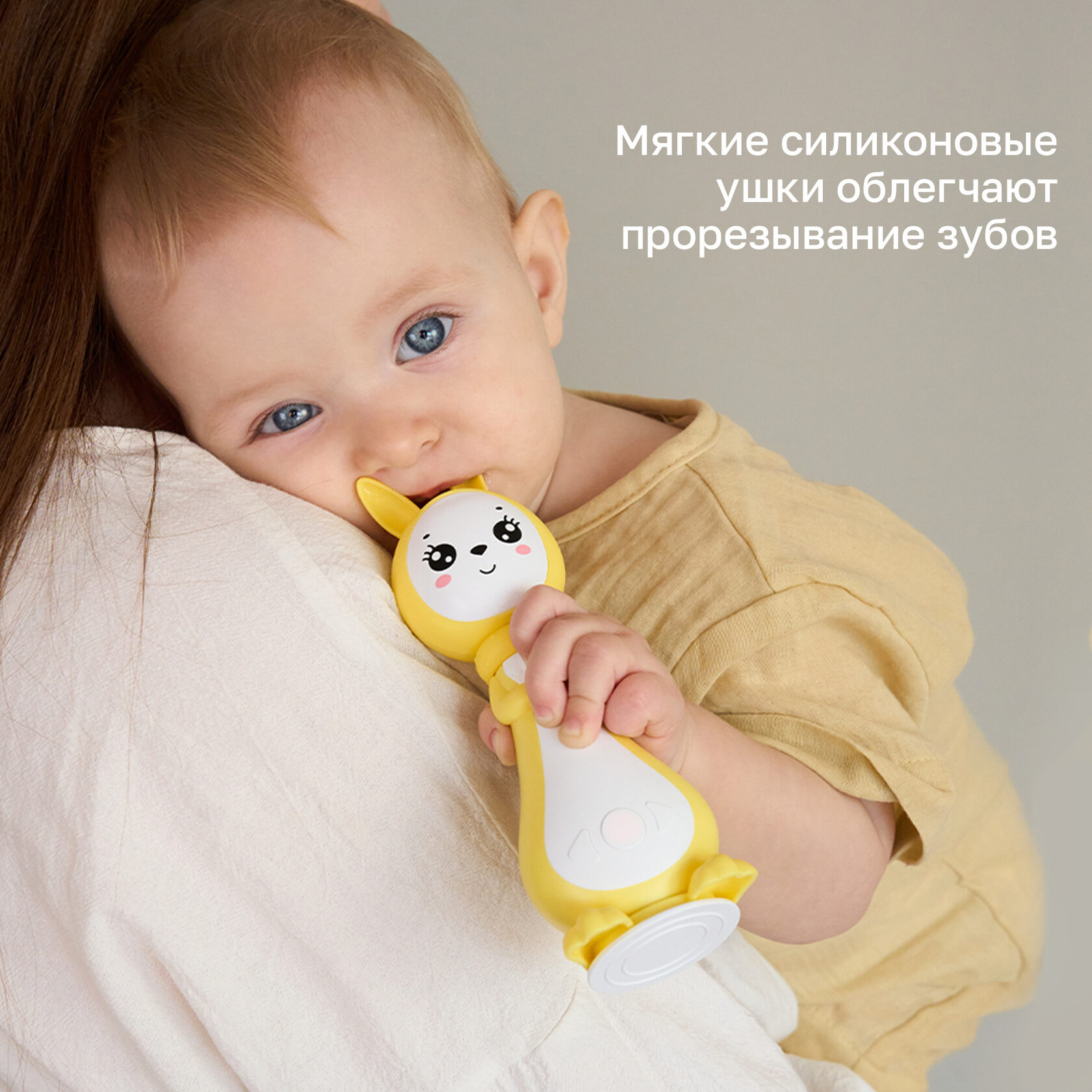 Игрушка изготовлена из высококачественного ABS-пластика и гипоаллергенного силикона. Прочные силиконовые ушки выдерживают нагрузку до 8 кг, выполняя роль удобного прорезывателя для зубов.