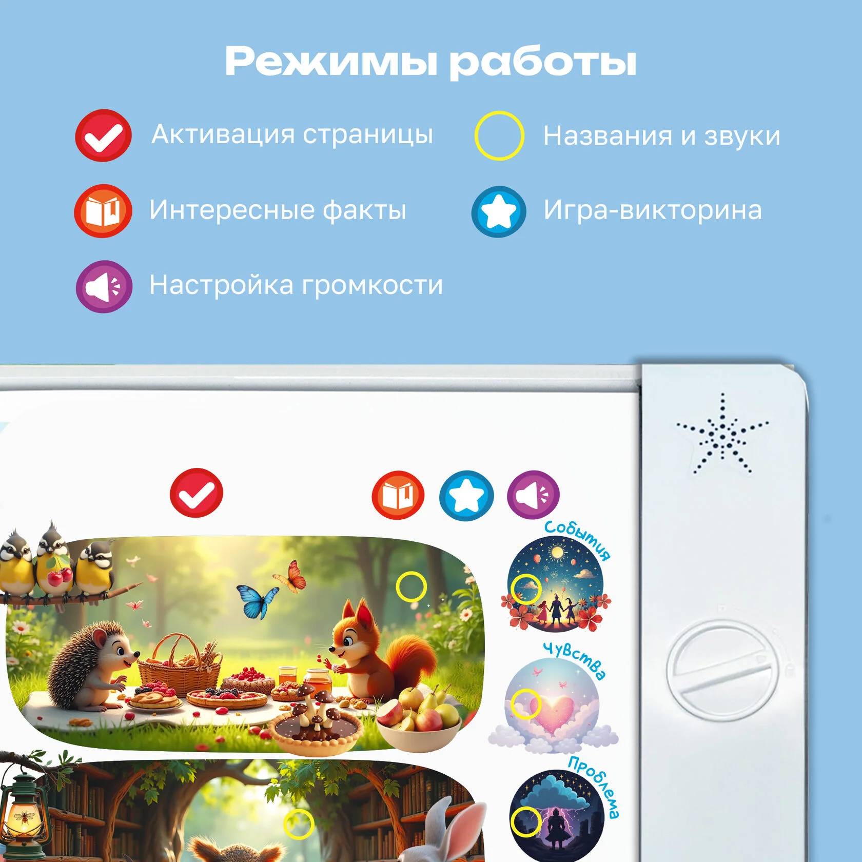 «Почемучки», «Динозавры», «Животные», «Первые знания» и «Развитие речи» – более 2500 звуков, фраз, вопросов и 55 обучающих тем! Для каждой тематики предусмотрен свой уникальный режим, который поможет малышу запомнить новые названия, развивать внимание, усидчивость и связную речь.
