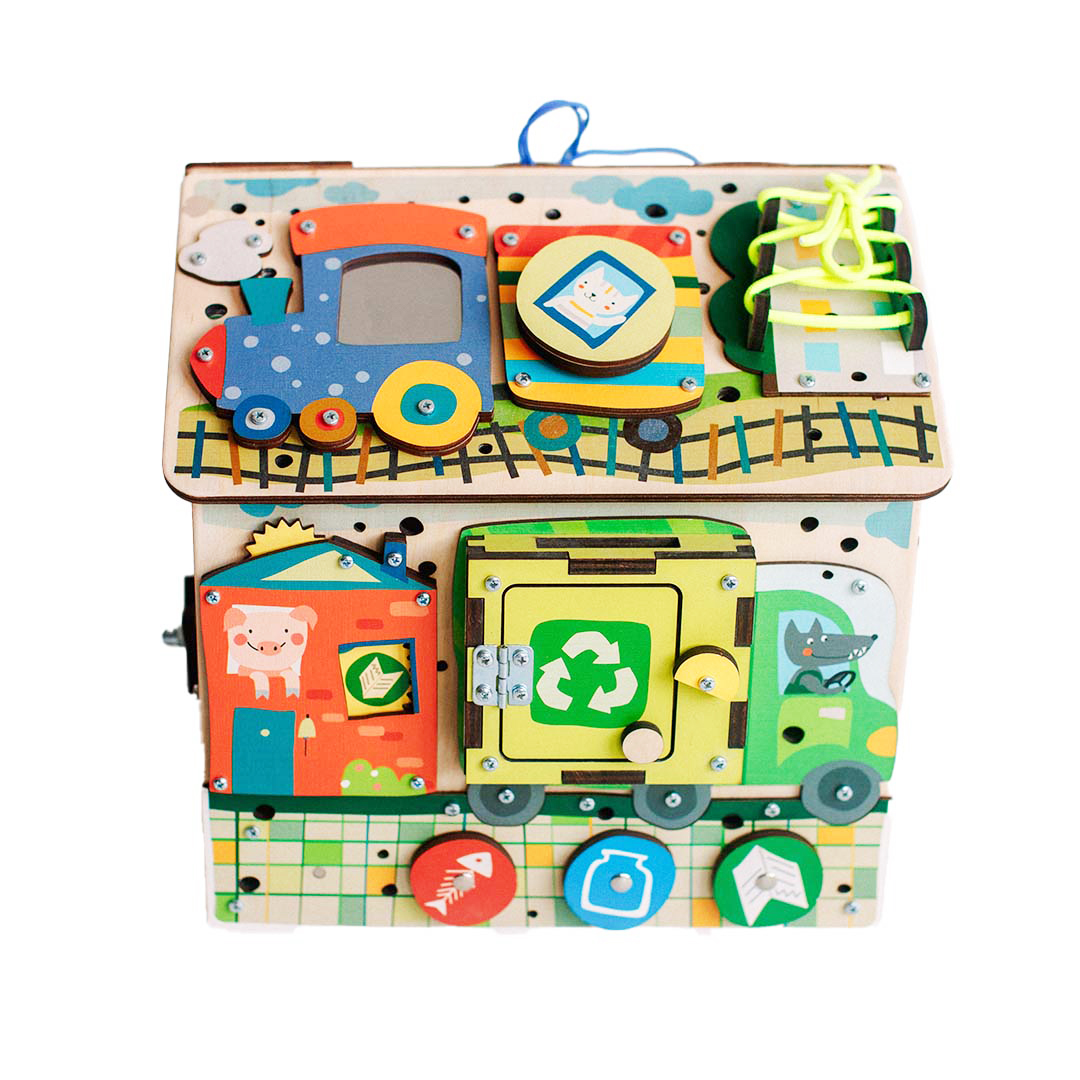 Паровозик Паровозик везет не только вагоны, но и подсветку! Повернув выключатель, малыш включает свет внутри домика. Батарейки надежно спрятаны, доступ к ним есть только у взрослых. Рядом — шнуровка, которая станет важным навыком для будущей самостоятельности.