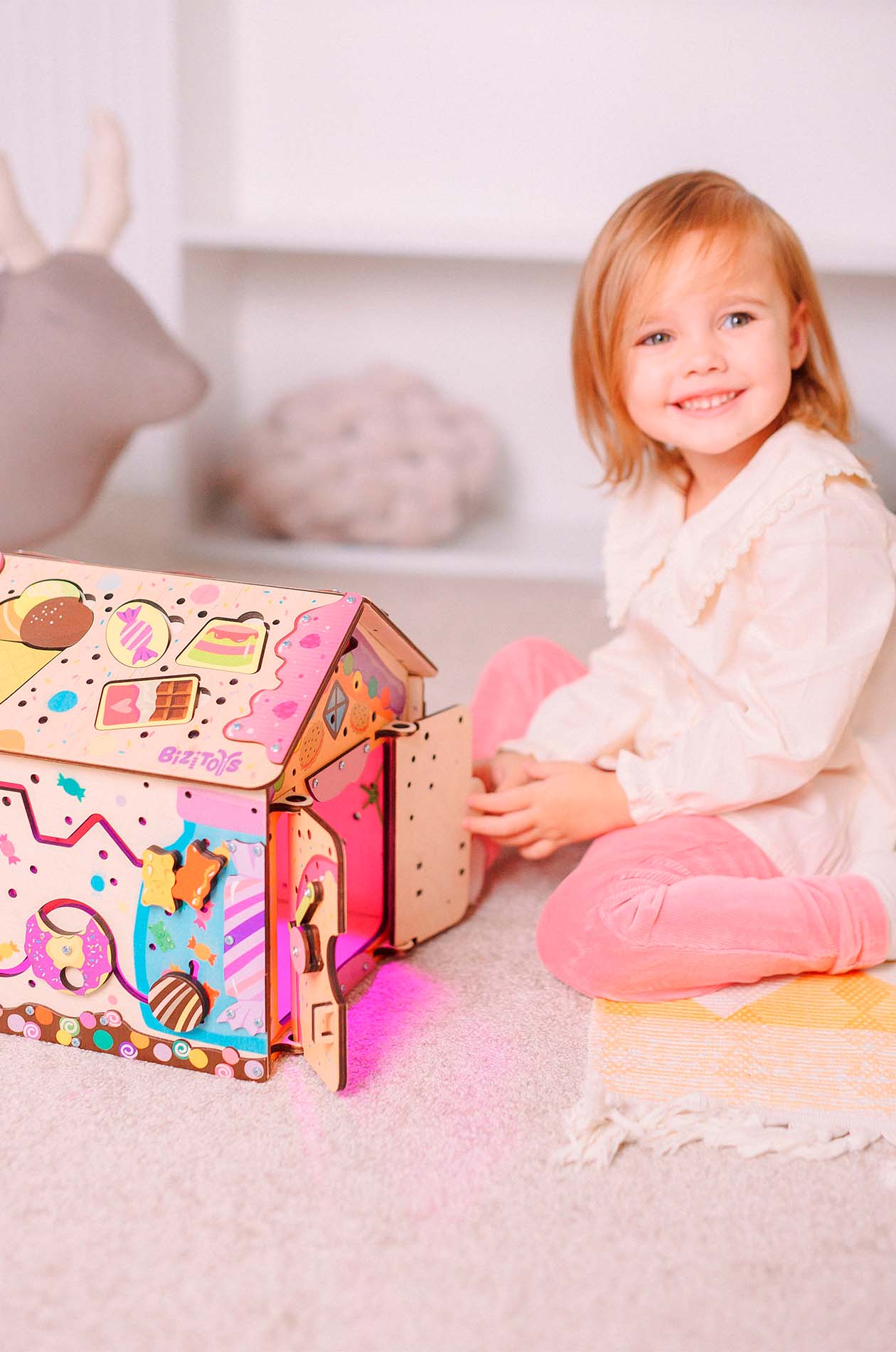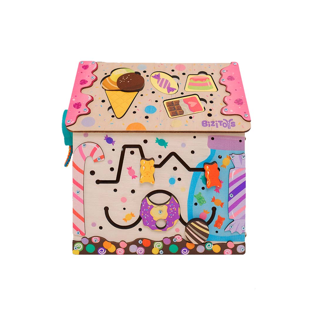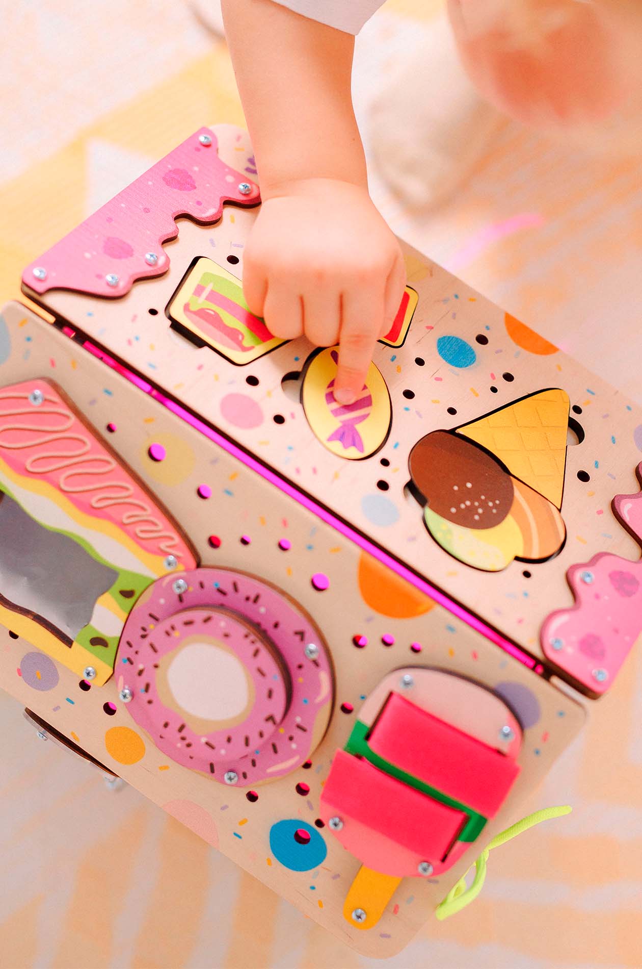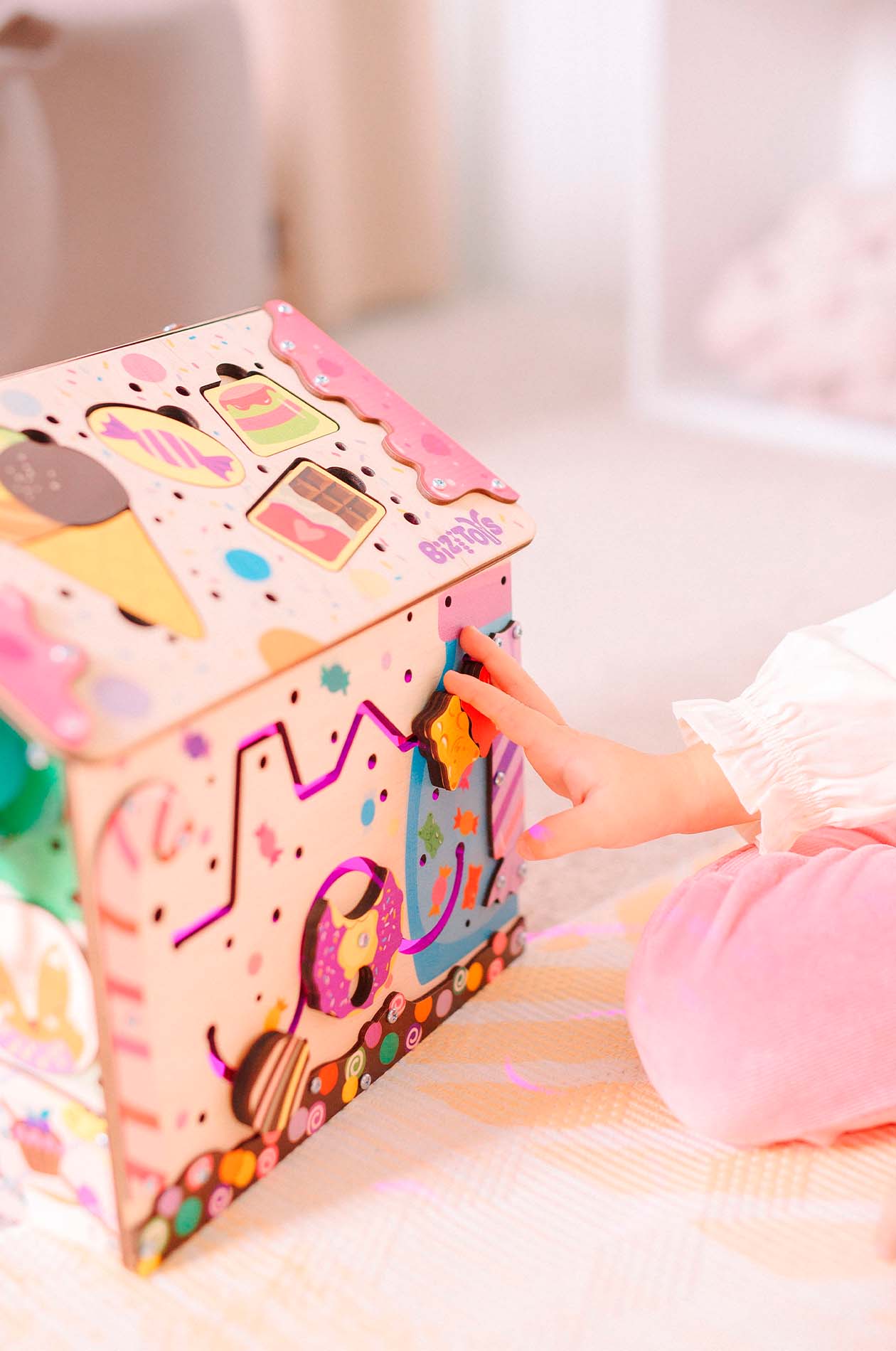 Милый бизидомик для маленьких девочек сладкоежек. Сделан согласно методике Монтессори. На домике закреплено 15 разных элементов для развития мелкой моторики, координации движений, логики и воображения.