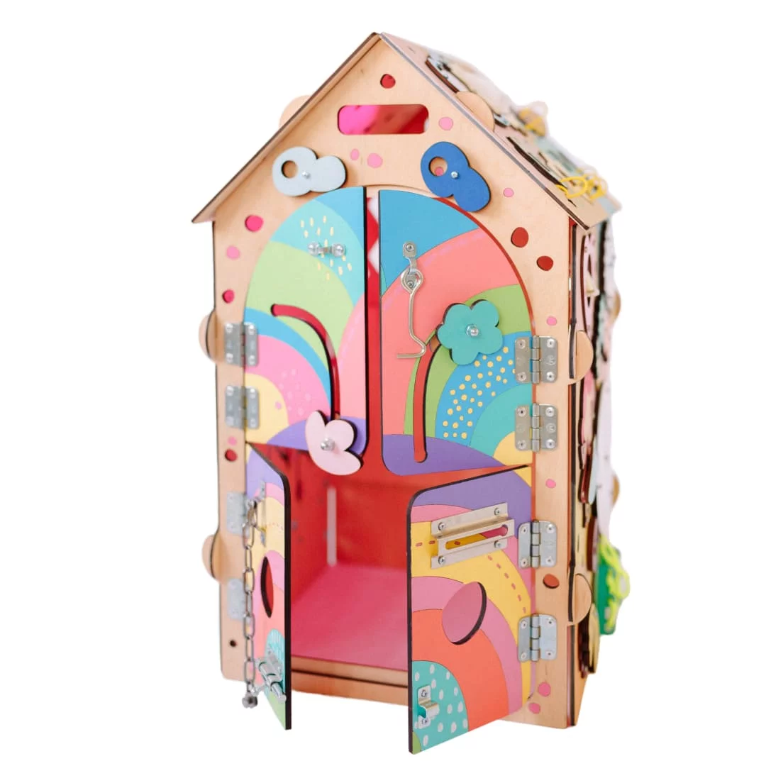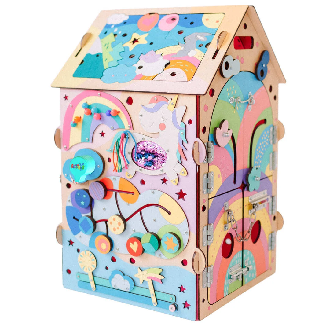 На животике у единорога закреплены разноцветные пайетки. Хвостик из ярких ниточек, которые плотно закреплены к стенке домика. Их можно перебирать пальчиками и научиться завязывать косички