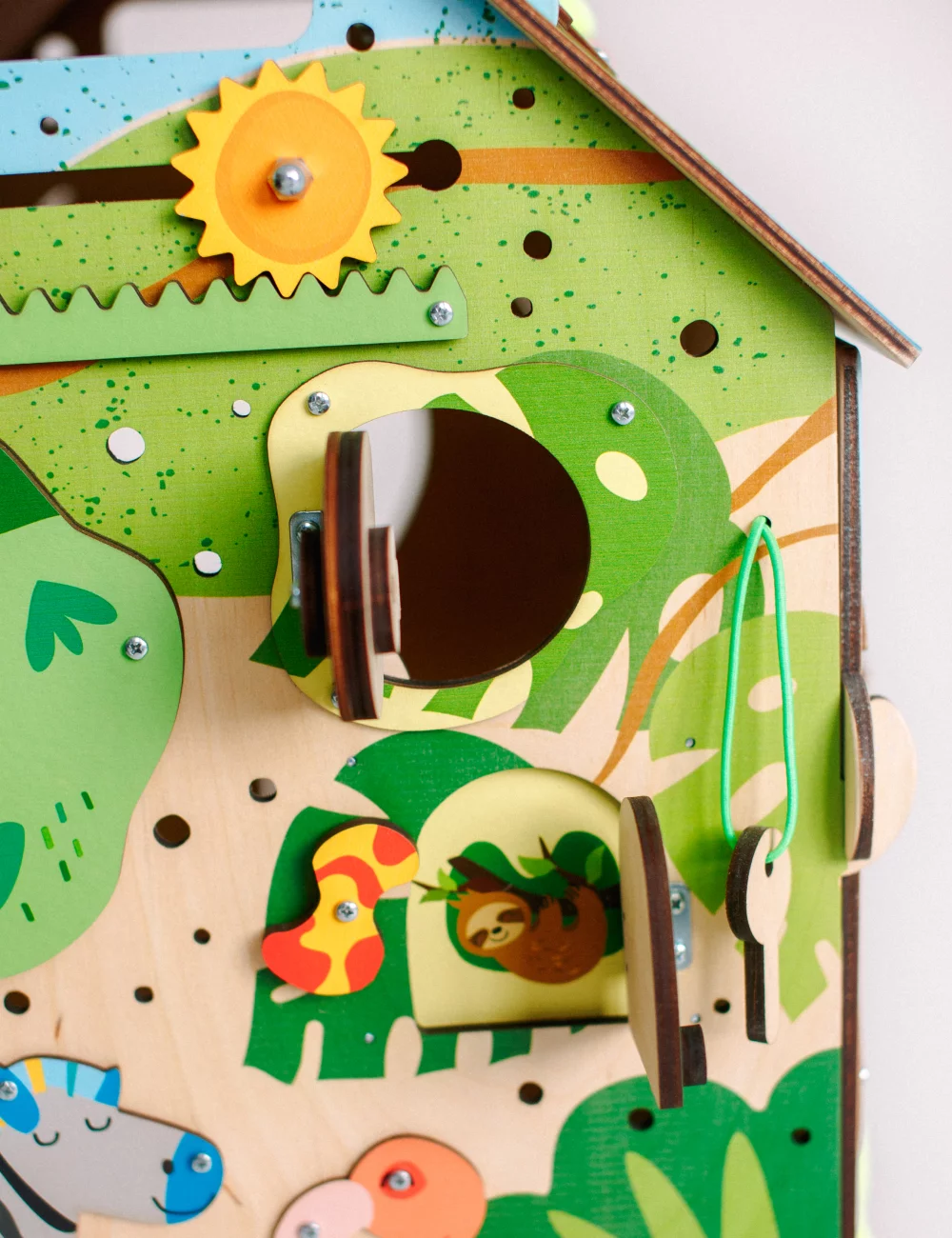 Солнце в виде шестерни расположено на самом верху стенки. Оно передвигается по зубчикам “ветки дерева”. Такой элемент знакомит ребенка с логикой работы шестерней. Дверка на деревянном замке научит ребенка с ключами. Посмотри левее. Под деревом есть маленькая шестеренка. Когда ты будешь ее вращать, животные на дереве будут меняться! Такой игровой элемент надолго увлечет ребенка