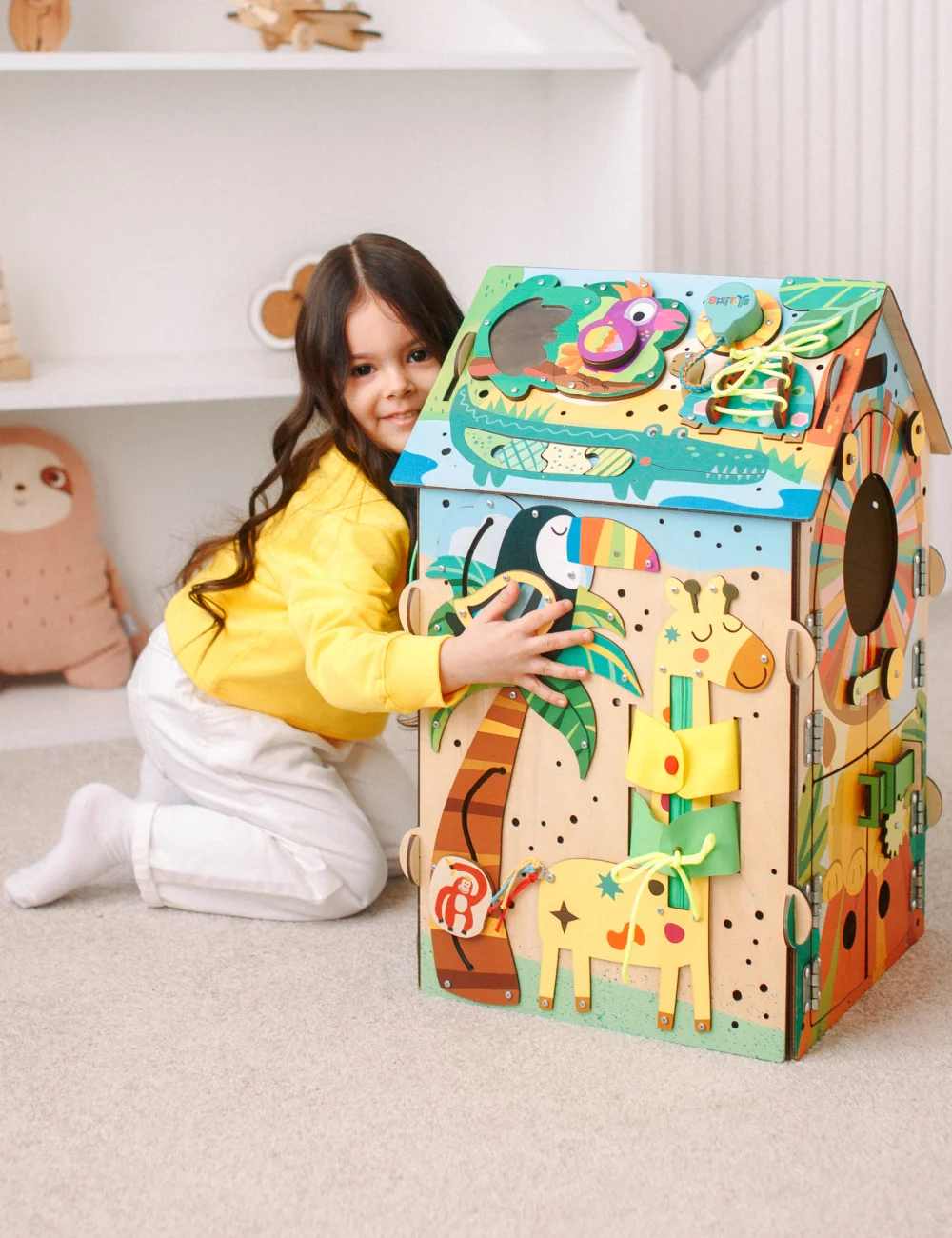 Шея жирафа станет тренажером первых бытовых навыков ребенка! Ребенок может научиться: завязывать шнурок, застегивать пуговицы, застегивать молнии. Возможно, после игр твой ребенок будет сам себя собирать в детский сад! Хвостик жирафа сделан из мягких ниточек. Ребенок может завязать на нем косы