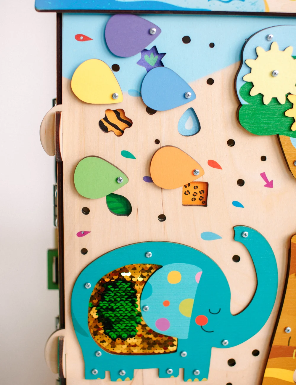 Если ты бросишь монетку в дырочку на стволе дерева (ее показывает маленькая фиолетовая стрелочка), то монетка скатиться вниз к озеру. Рядом с ним стоит слоненок. На его животе закреплена ткань с пайетками. Если ты проведешь рукой по ним, то они поменяют цвет. Слоненок поливает себя цветными капельками. Они могут вращаться, что будет развивать мелкую моторику у ребенка