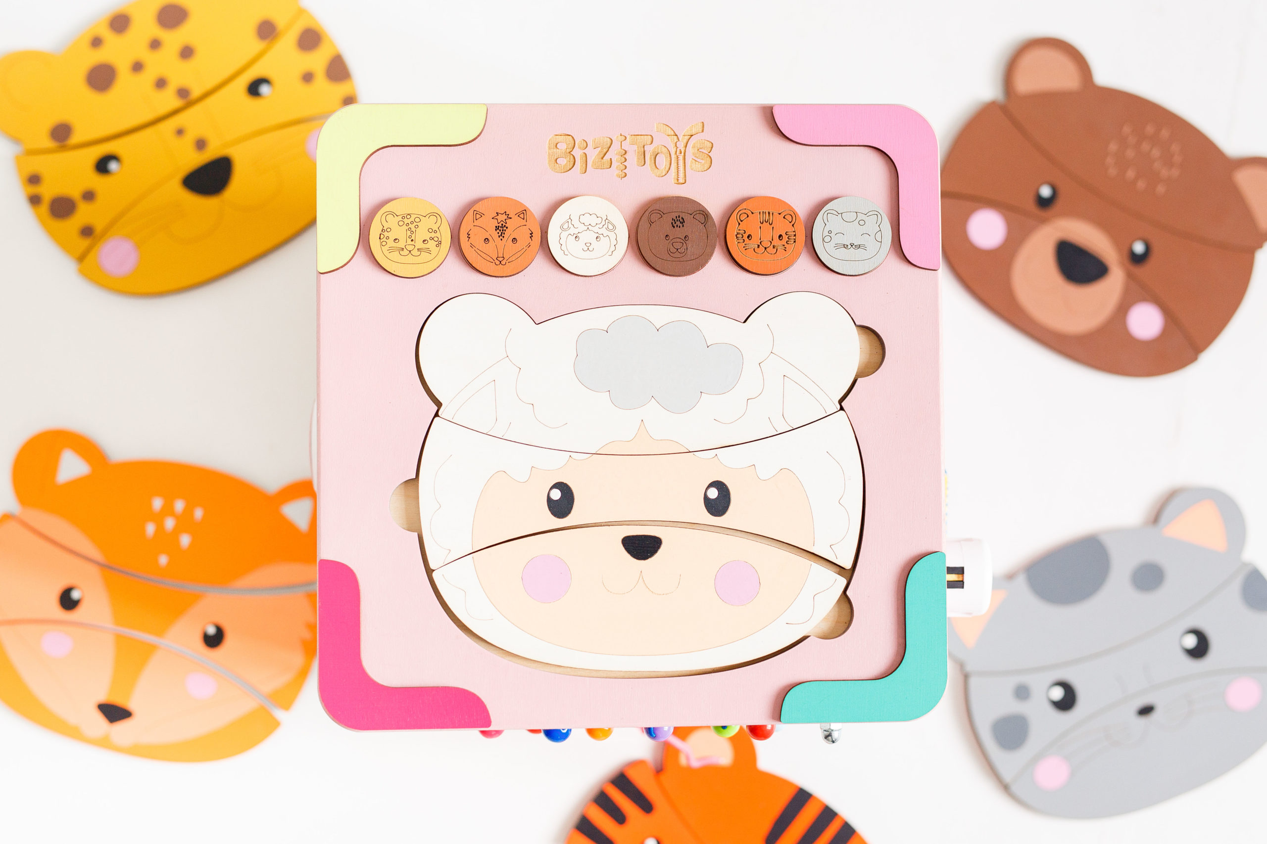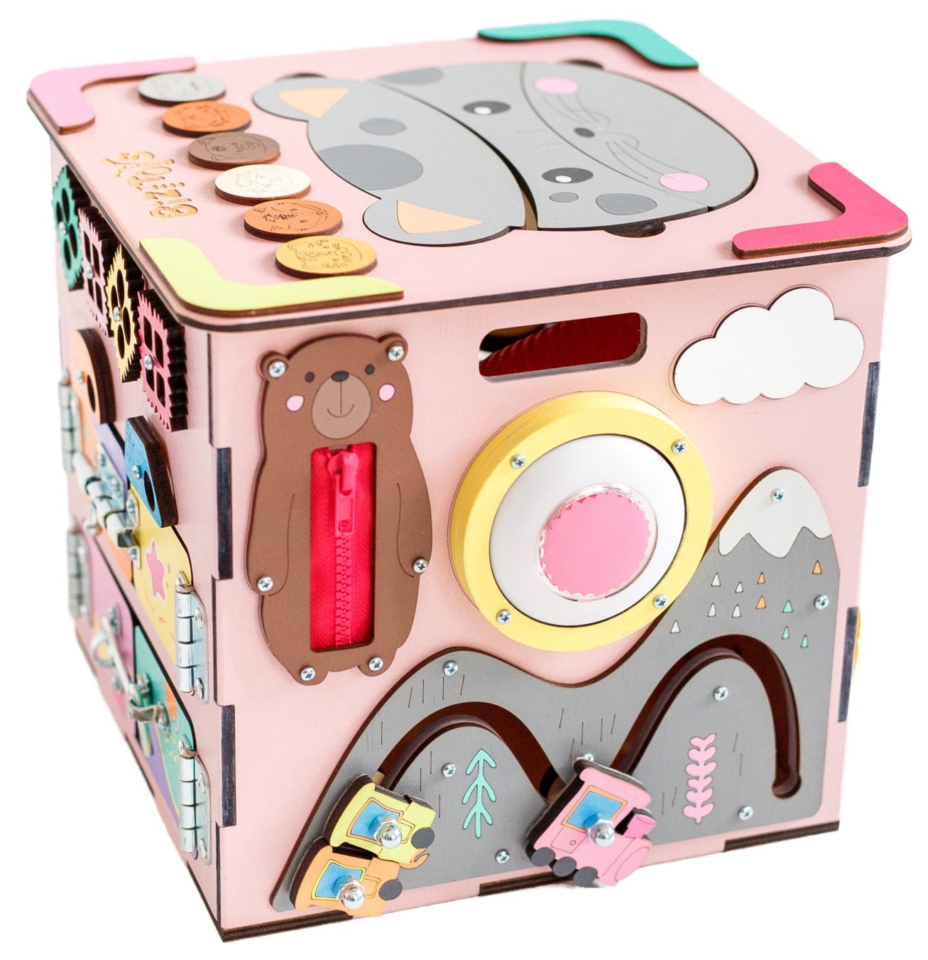 Уникальный и очень красивый бизибокс! На крыше такого бизикуба находятся животные, которые необходимо собирать из 3-ех частей. Сравнительно небольшие размеры бизибокса вмещают в себе элементы на развитие мелкой моторики, усидчивости, логическое мышление, координацию движений.