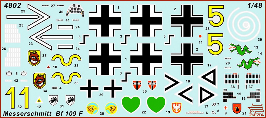 Историческая справка: BF 109 F2 «Мессершмитт» поступил в люфтваффе в 1941 году. Его вооружение состояло из 15мм скорострельной пушки MG 151 с темпом огня 950 выстрелов в минуту. Новинкой было использование электропривода для ее перезарядки. Тропический вариант F-2 с дополнительными воздушными фильтрами выпускался для службы на фронтах, где пыль составляла большую проблему: североафриканском театре и южном участке восточного фронта. В середине Второй Мировой Войны на BF 109F летали 7 самых известных асов.