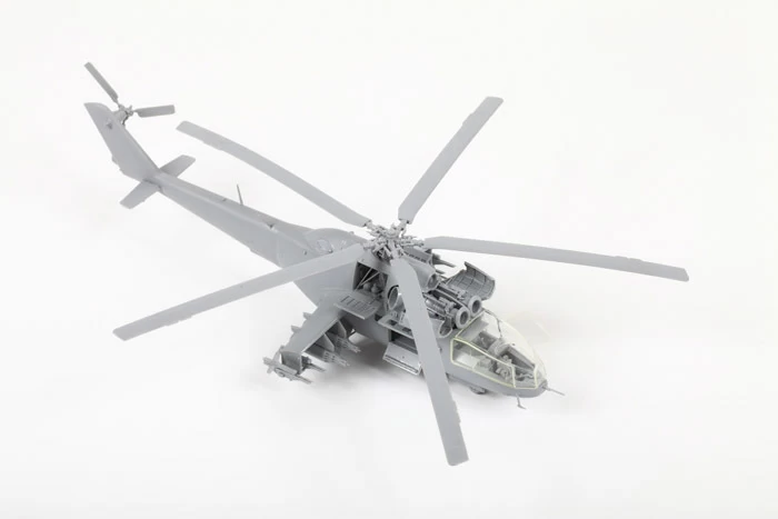 Историческая справка: Вертолет Ми-24А стал первой в мире «летающей БМП». Он не только перевозил 8 человек десантников, но и имел мощное бортовое оружие и надежную броневую защиту. Опытный экземпляр этого вертолета взлетел летом 1969 г., а уже в 1970-71 гг. Ми-24А начали поступать в войска. Пилот и оператор бортового комплекса вооружения защищались боковыми броневыми листами, лобовым пуленепробиваемым стеклом и бронированными сиденьями. Бронеплиты были установлены и на капотах двигателей. Вертолет получил двигатели и редуктор от хорошо зарекомендовавшего себя и надежного транспортного Ми-8. Вооружение на первой модификации состояло из пары ПТУР 9М17 противотанкового комплекса «Фаланга-М» с ручной системой наведения, подвижной установки НУВ-1 с крупнокалиберным пулеметом, блоков неуправляемых ракет или бомб.