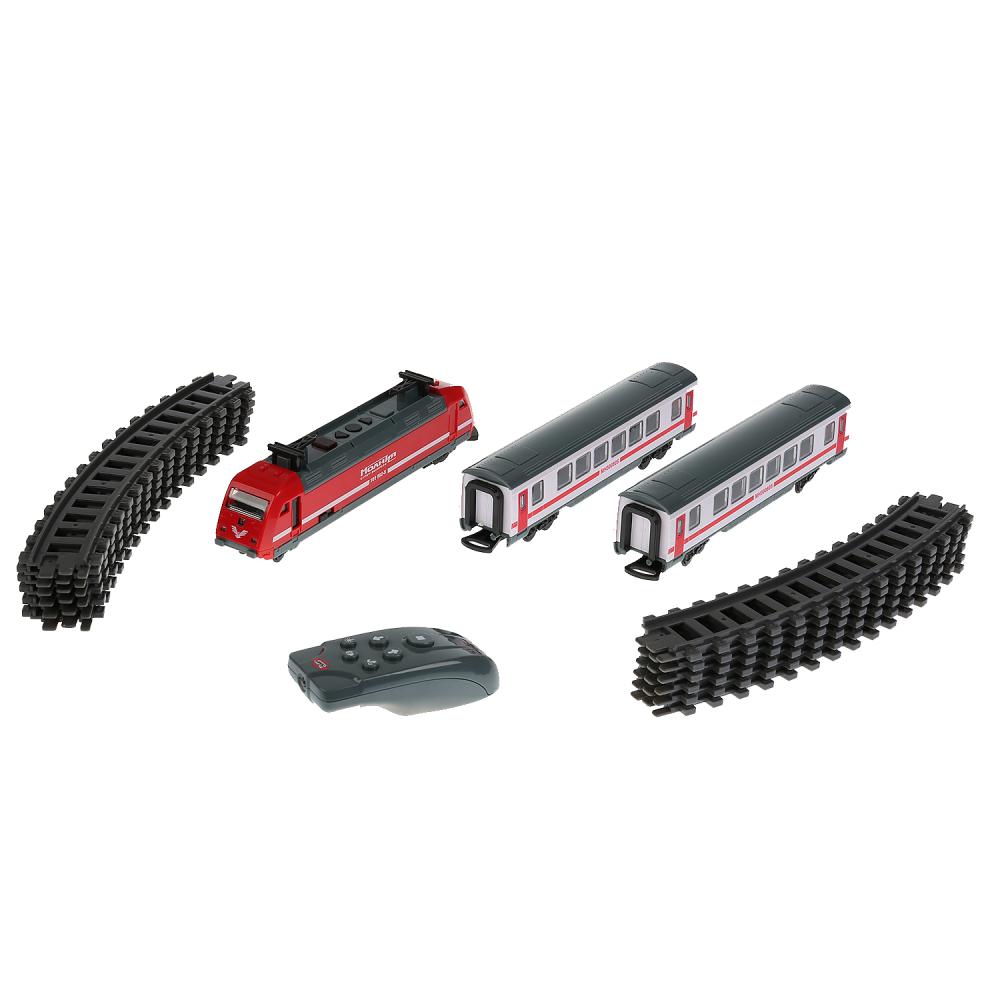 поезд, 2 вагона, пульт управления, детали железной дороги. |