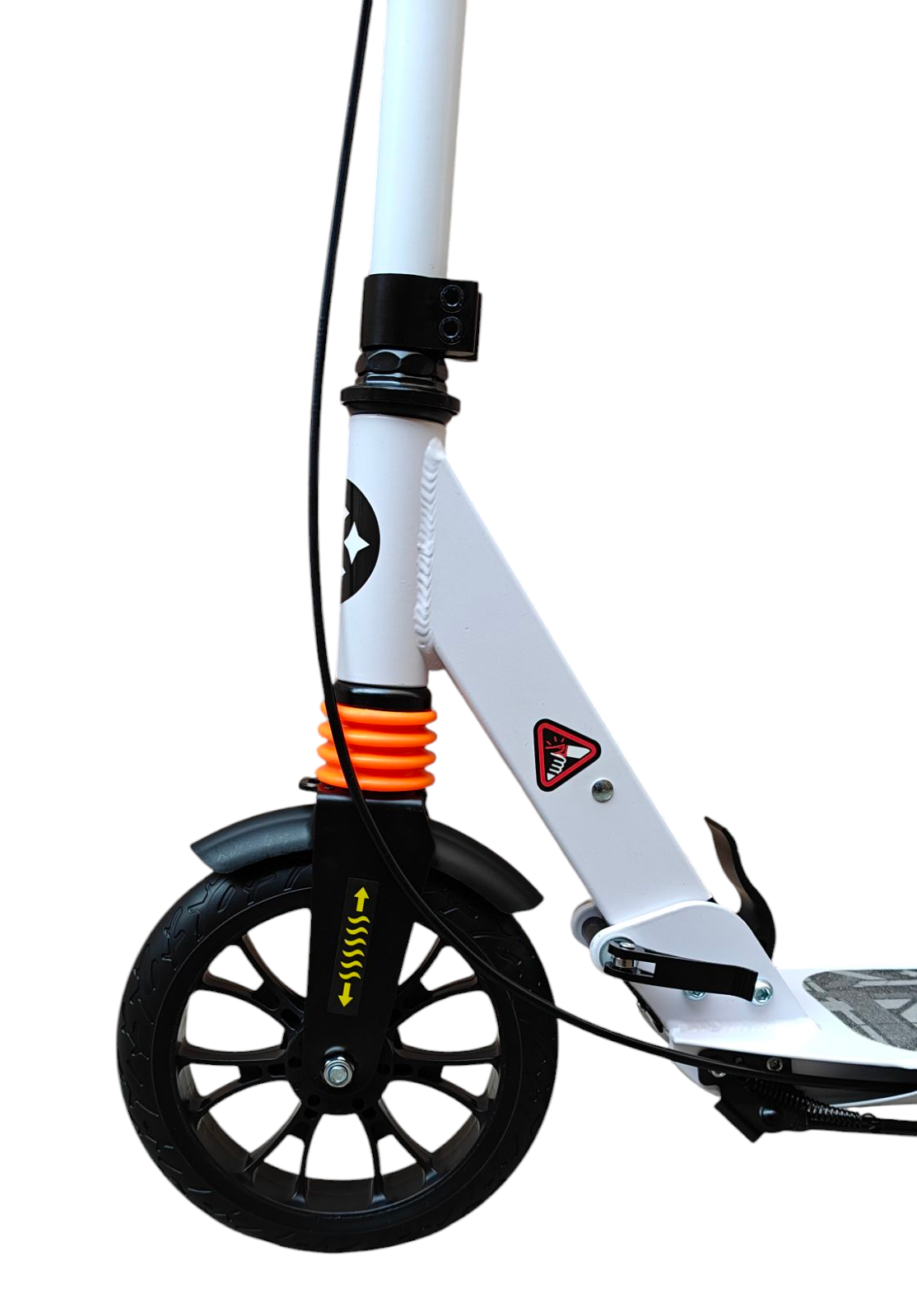 Самокат оснащен 200 мм резиновыми монолитными колесами с протектором, их невозможно пробить, но в то же время сцепление у резиновых колес выше, чем у полиуретановых — это становится наиболее актуально при езде по паркам, песчаным и гравийным дорожкам.