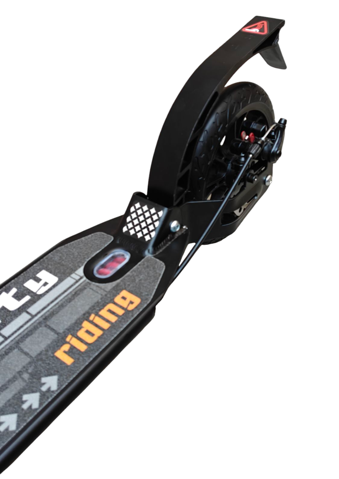 Первое и основное отличие данного самоката - это задний дисковый ручной тормоз. В отличии от всех самокатов, в которых торможение в любом случае идет за счет соприкасания металла с полиуретановым колесом, в данной модели установлен дисковый тормоз по принципу велосипеда или мотоцикла, что позволяет значительно повысить эффективность торможения на любой поверхности и в любых погодных условиях. Также на самокате помимо ручного тормоза установлен и классический тормоз задним крылом.