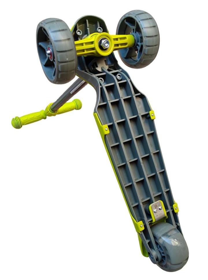 Дека самоката выполнена из прочного и легкого пластика и усилена пластиковой противоскользящей накладкой сверху. Ширина деки в широкой части - 12 см, длина рабочей поверхности (места для ног - 29 см). Общая длина самоката - 55 см.