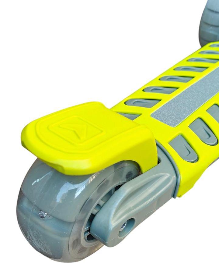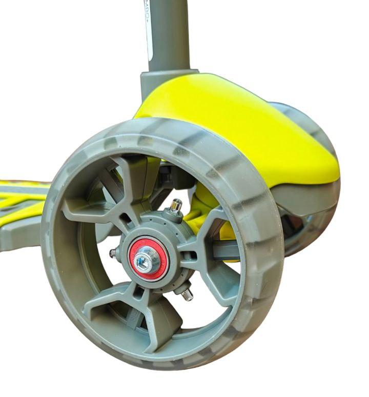 Модели 2020 года мы оснастили более широкими колесами (передние 120х40 мм и 100х45 мм заднее) со специальным полиуретановым покрытием - такие колеса дают лучшую амортизацию и проходимость при сохранении наката, особенно это чувствуется на тротуарной плитке. Подшипники вместо используемых в ранних моделях стандарта ABEC5 заменены на ABEC9. Заднее колесо оснащено крылом-тормозом. Все колеса самоката имеют так любимую детьми светодиодную подсветку, которая работает при движении.